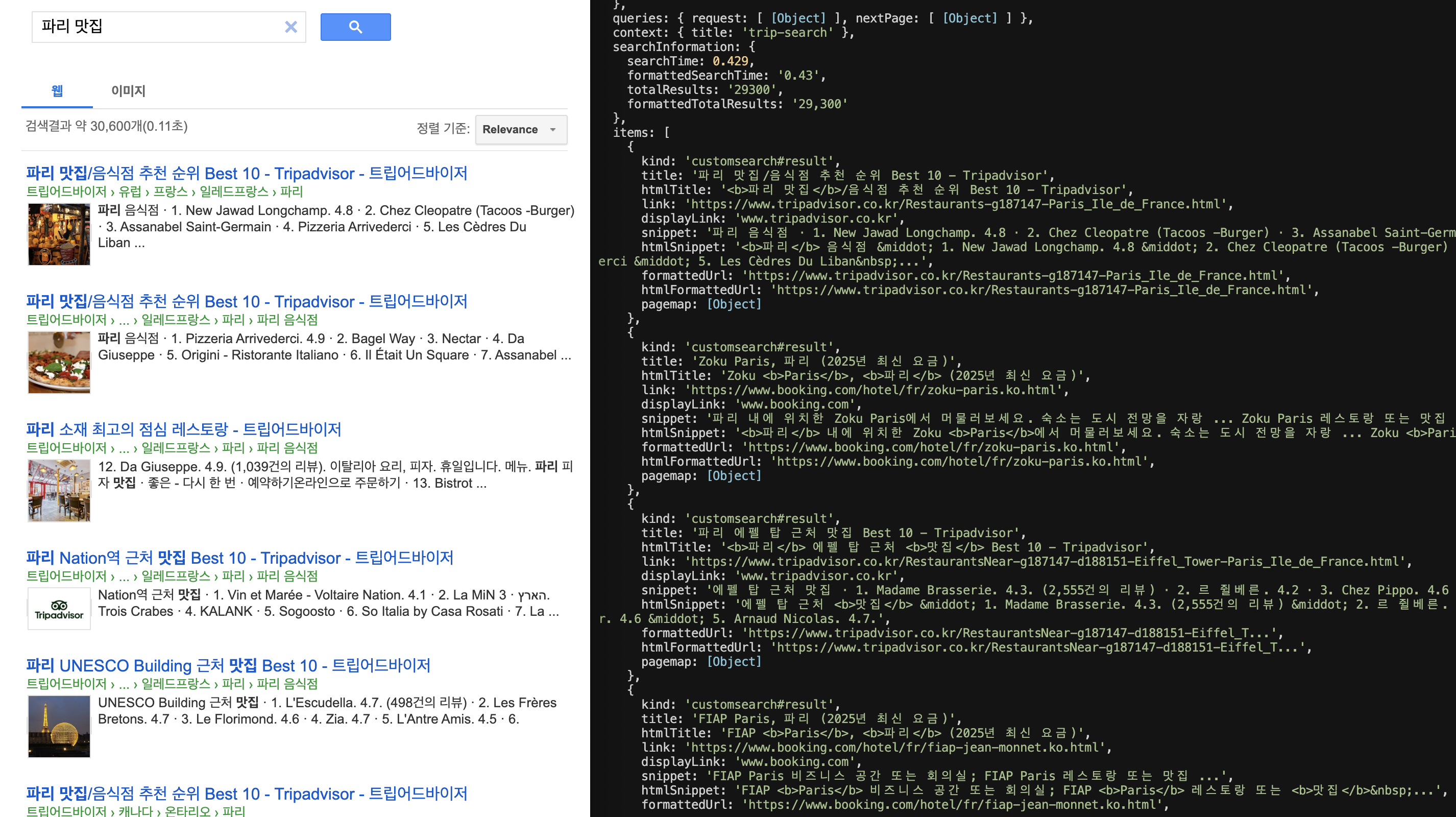 왼쪽 검색 결과에 대한 모든 데이터를 오른쪽의 JSON 형식으로 받을 수 있는 것이다.